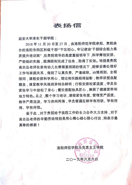 6月10日下午,公司收到一份来自洛阳师范公司马克思主义公司的表扬信,信中写到在2018年10月20日至27日在公司参加培训,期间得到公司科学的筹划安排及班主任高志远老师周到细致的服务,达到了良好的培训效果。