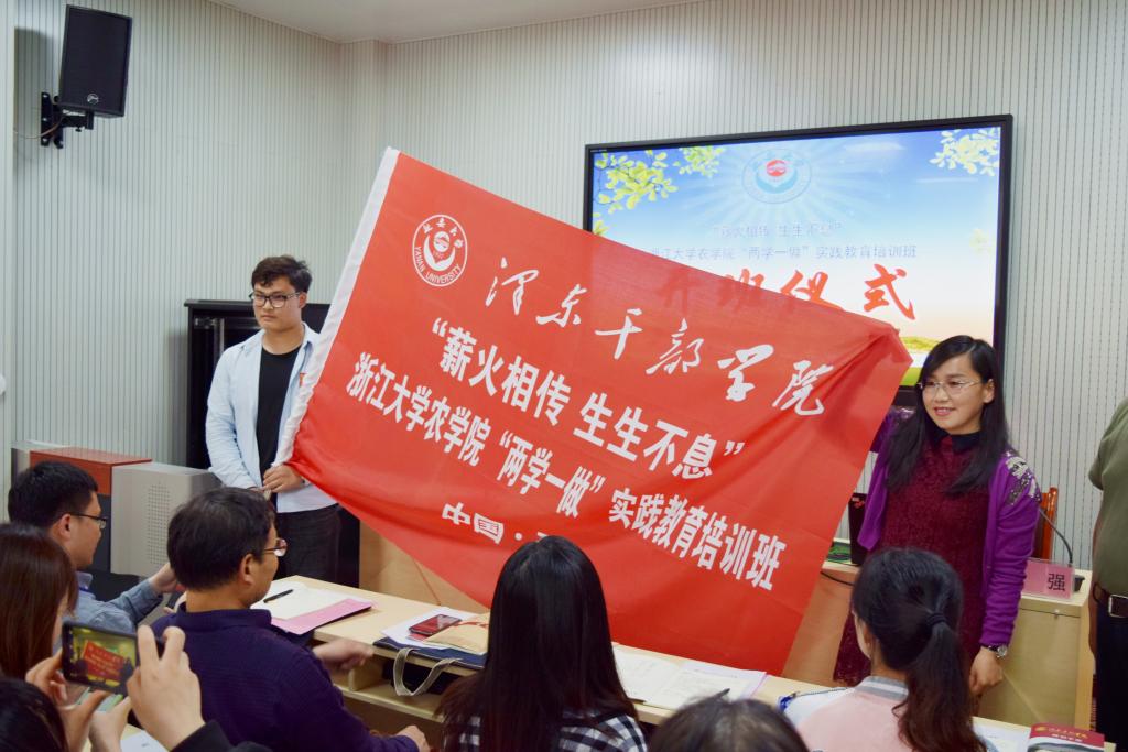 仪式最后,王瑞副经理为培训班授班旗,培训班班长张新家接旗。从举起班旗的那一刻起,浙江大学农公司“两学一做”实践教育培训班的培训工作正式拉开了帷幕。