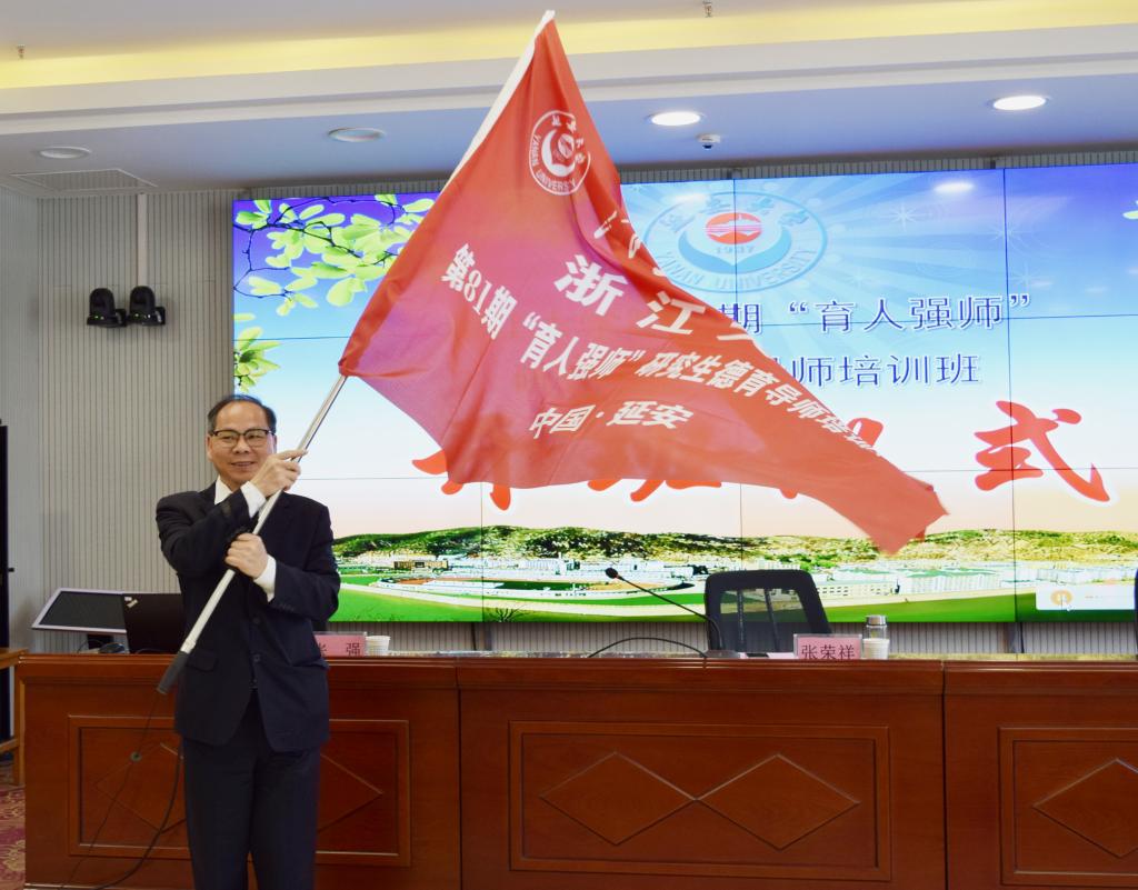 仪式最后,培训班班长王宣银接受了拓宏伟经理授予的班旗,并舞动它,代表着浙江大学第