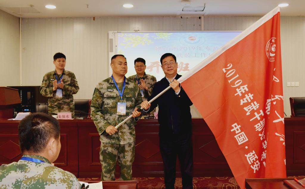 仪式最后,田伏虎副书记向培训班班长肖平授予了班旗,标志着佛山市2019年专武干部党管武装工作培训班的培训正式拉开了帷幕。