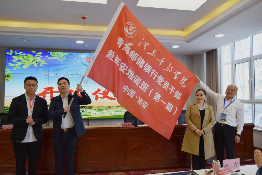 仪式最后,公司副经理王瑞为培训班代表邮储银行青海省分行纪委书记姚曼琳授予青海邮储银行党员干部赴延安培训班(第一期)班旗。
