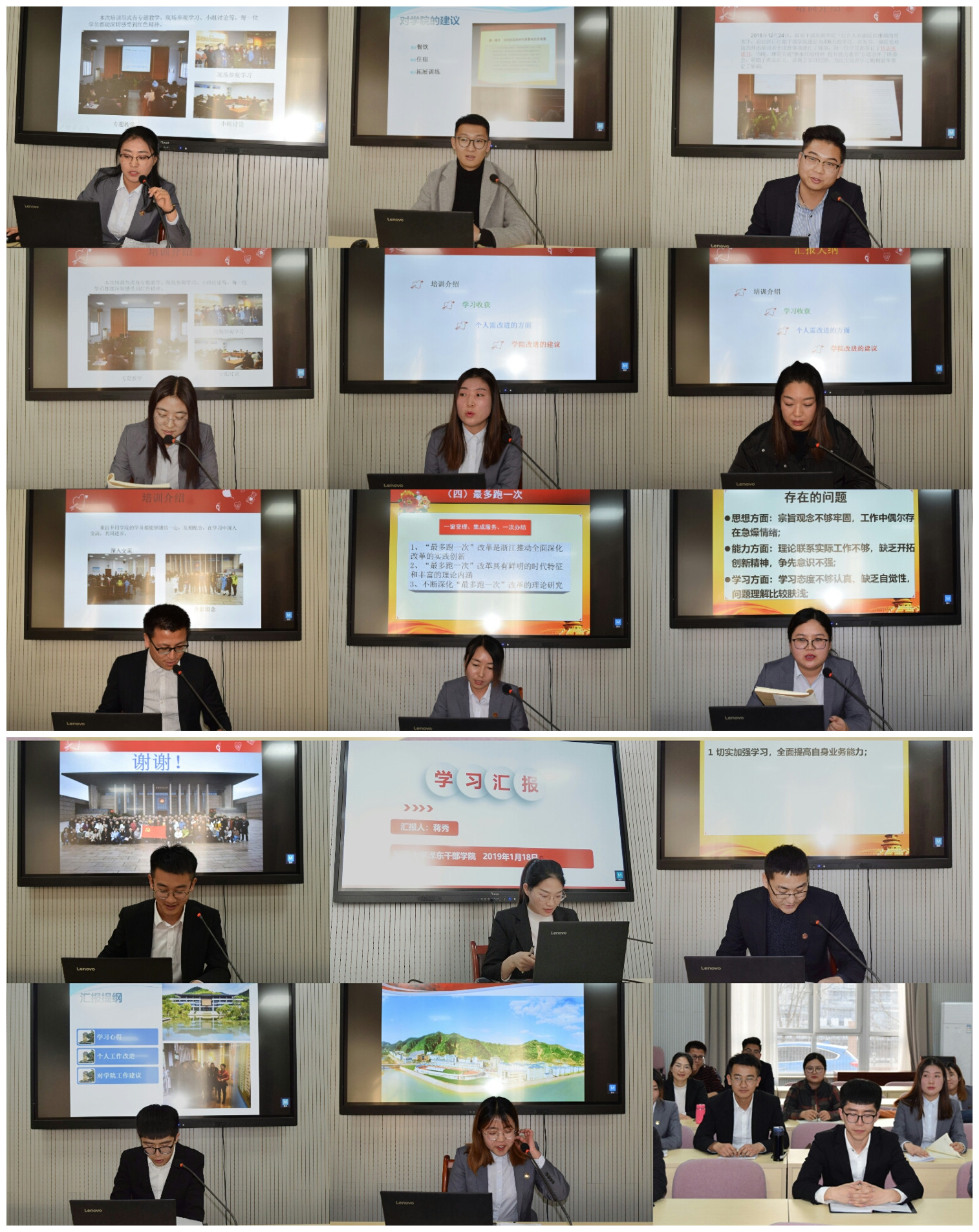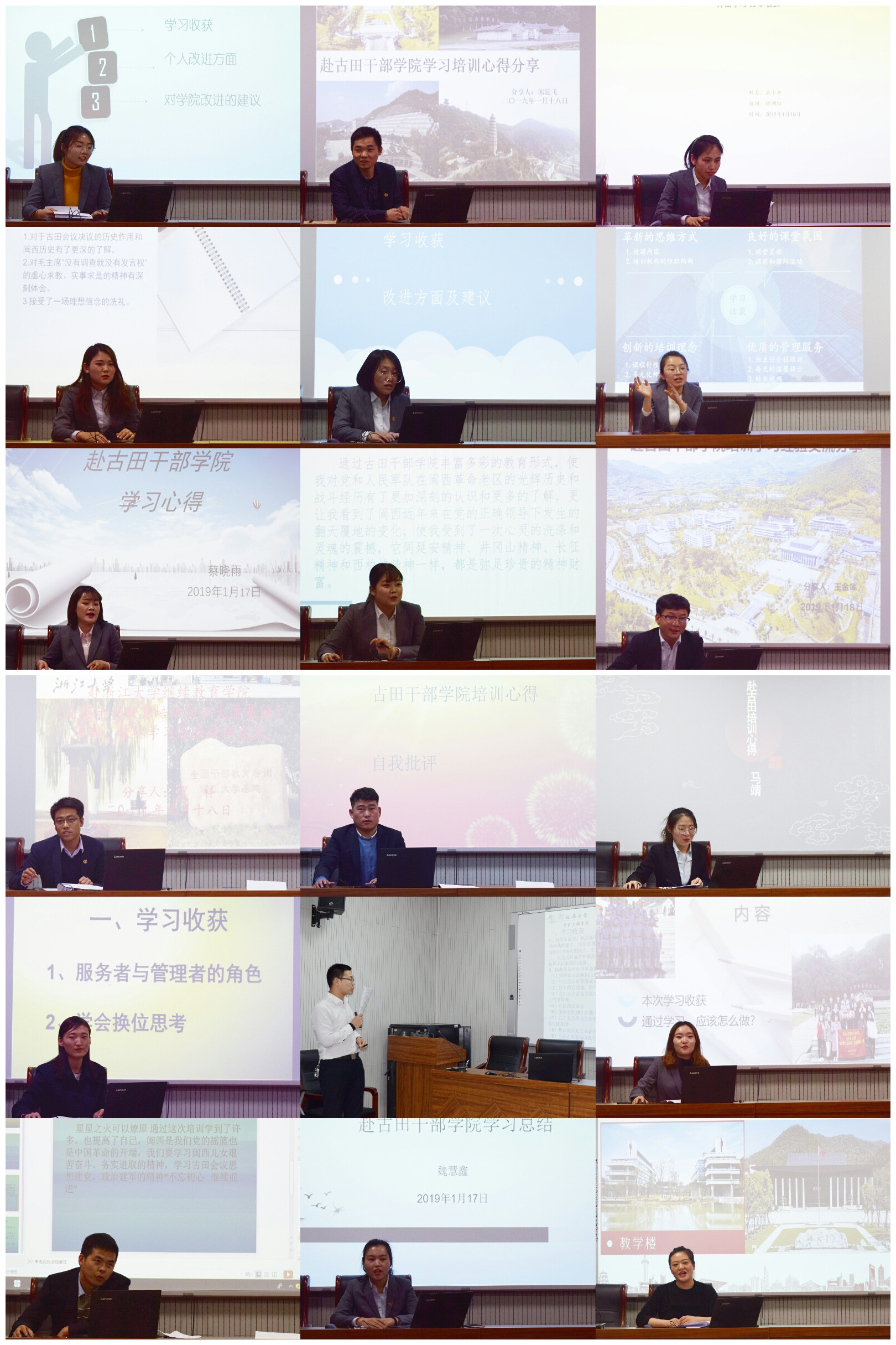 参加浙江大学、红船公司、古田公司学习的全体员工分成两组,即行政人员组及班主任组,行政组由综合科科长王娜主持,班主任组由培训科科长赵廷凯主持。全体员工分别通过PPT对培训期间的收获、结合个人工作需改进方面以及对公司工作的建议进行总结分享。